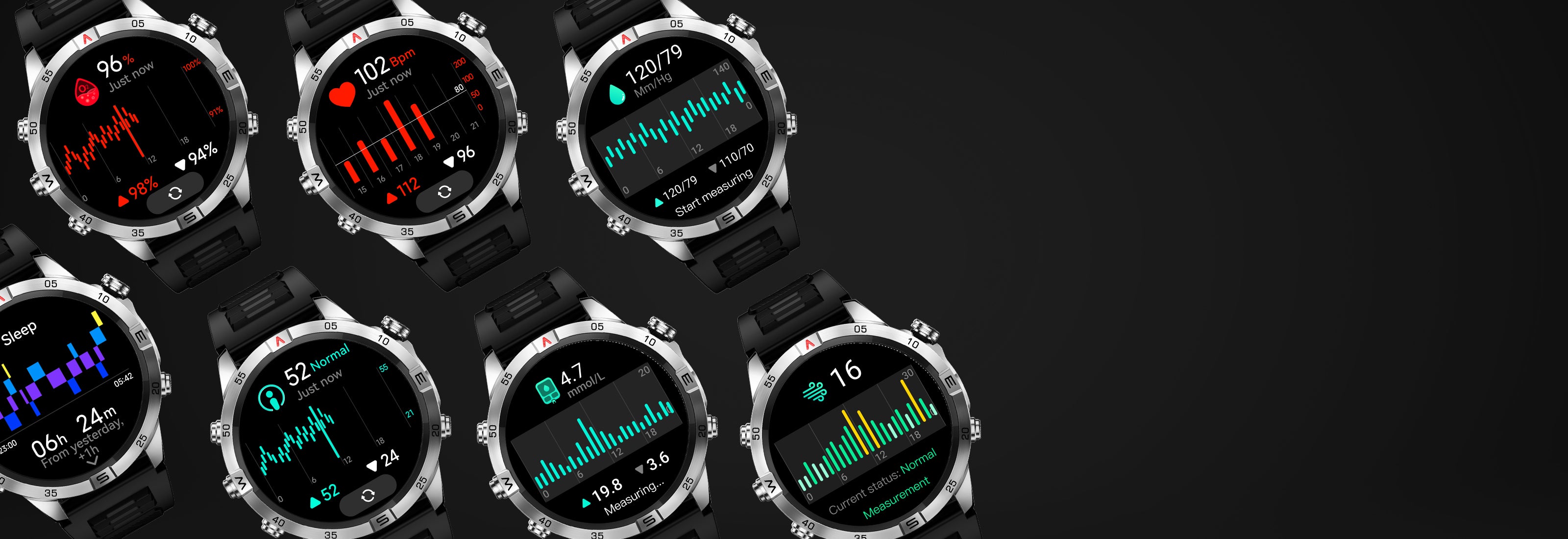 - Auto Measurement: Heart rate, Blood-oxygen saturation, Stress level.